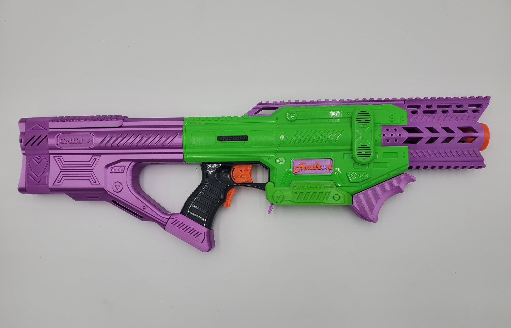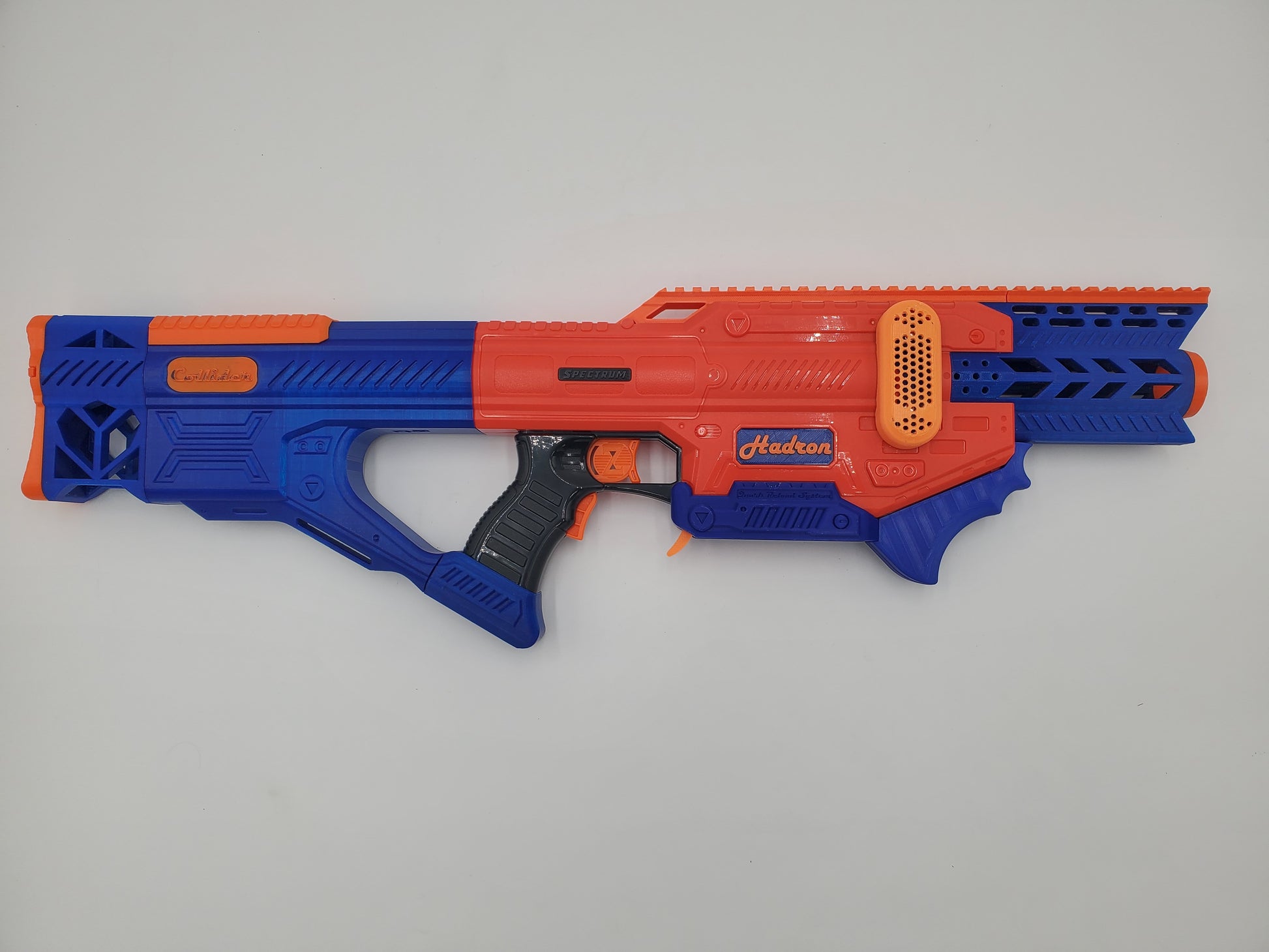 Notes on Modified Red 1 - Still stock (not-pro): Magazine not included. Shortened muzzle, new rail on top, 3D-Printed battery door, and an N-Strike stock attachment point. Scope included.